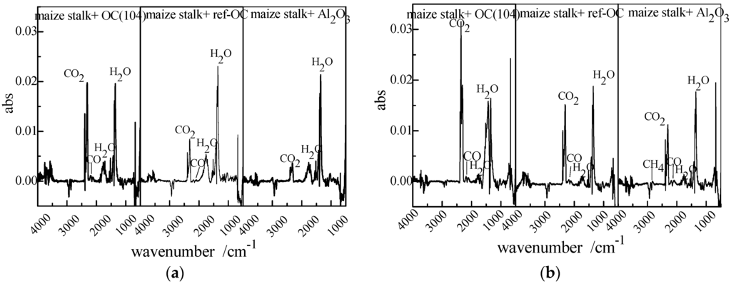 The reaction between Fe2O3(104)/Al2O3 and maize stalk at the mass ratio of 10:1 was conducted in a simultaneous TGA (TGq500, PerkinElmer, Boston, MA, USA) under nitrogen atmosphere. The mixture of maize stalk with Fe2O3(104)/Al2O3 was loaded to the ceramic pan of the TGA, and then heated from ambient to 800 °C at 15 °C/min and hold for 10 min to ensure the sufficient conversion of fuel. The flow rate of N2 was 25 mL/min and the total mass of mixture was 10 mg. As a comparison, reactions between maize stalk and Fe2O3/Al2O3 as well as Al2O3 were also performed under the same mass ratio and conditions. Gas phase products distribution emitted from TGA were further analyzed by FTIR spectrometer with the scanning range of 3500–1000 cm−1, and the resolution of 4 cm−1.