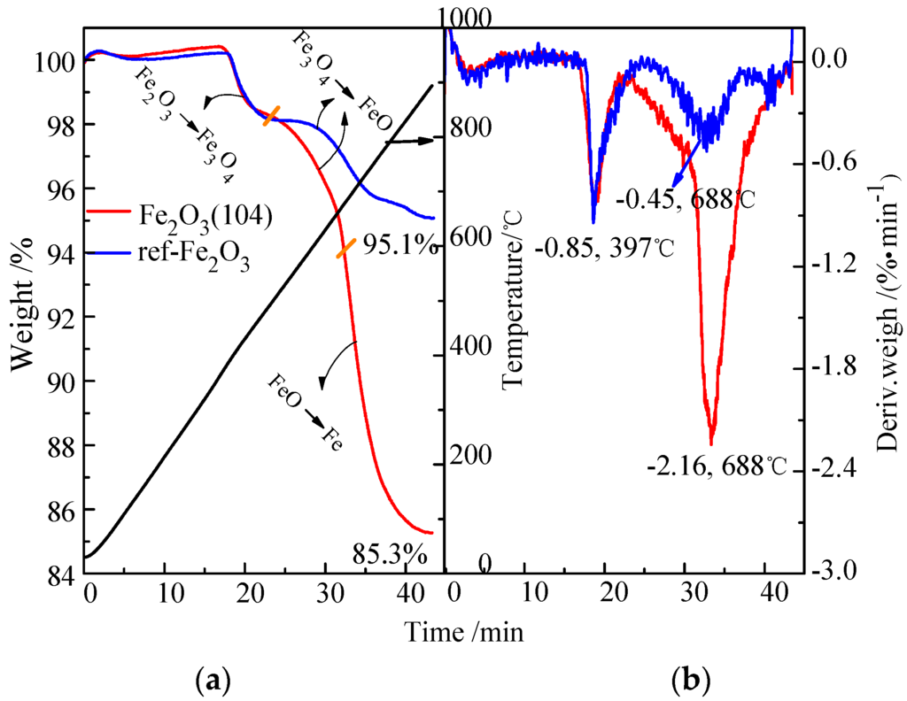 In addition, previous experiments suggested that the reduction reaction of Fe2O3 into Fe3O4 is very fast, while the further reduction reaction from Fe3O4 to FeO and even from FeO to Fe is much slower [,]. In this work, despite the promoting effect of temperature increase on OC reactivity, the reaction rate of Fe2O3/Al2O3 at 688 °C is still lower than that at 397 °C, which suggests the reduction degree of Fe2O3 is the main reaction rate-determining factor for Fe2O3/Al2O3 OC. Nevertheless, the adverse effect of reduction degree increase of Fe2O3(104) OC on its reactivity is obviously smaller than the promoting effect of temperature increase, which is why the reaction rate of Fe2O3(104)/Al2O3 continues to increase at its high reduction degree. This phenomenon indicates that the Fe2O3(104) has better oxygen transfer capacity even at its high reduction degree stage, corresponding to our previous theoretical investigation [], where the Fe2O3(104) surface can be deeply reduced into Fe while the deep reduction of Fe2O3(001) is difficult.