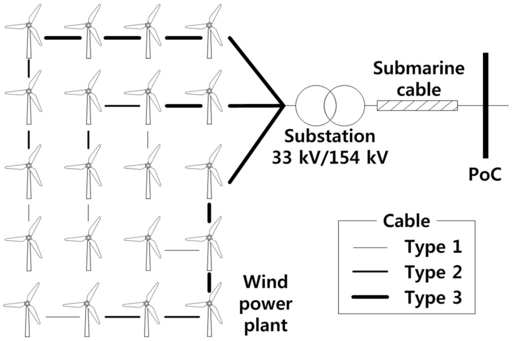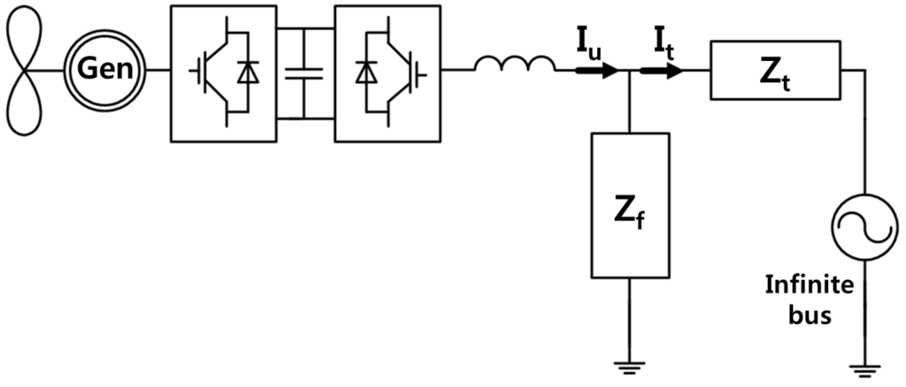 Figure 8 provides a test system configuration for the case study. Based on the WPP under development in Korea, the system is configured with 20 units of 5-MW full converter WTs from a single manufacturer with transformers and harmonic filters (Figure 3), a substation transformer, submarine cables connecting the WPP to the grid or connecting the WTs to each other and the equivalent grid impedance connected to the infinite bus.