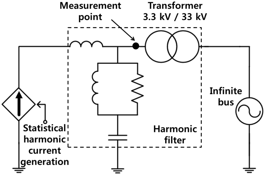 Configuration of the equivalent WT model comprising the equivalent harmonic source, harmonic filter and transformer connected to the infinite bus.