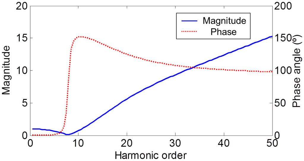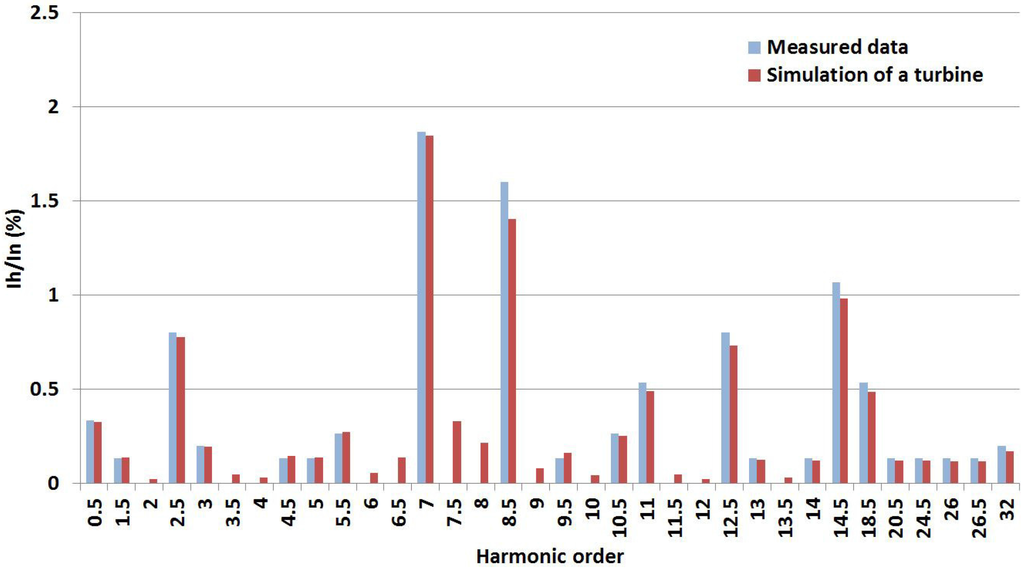 The turbine is equivalently modeled as a current source with time-varying harmonic components. The filter is placed between the turbine and the transformer connected to the infinite bus without the grid impedance, as mentioned before. The magnitude and phase angle of the restoration factor in the equivalent circuit with respect to the harmonic order are shown in Figure 5. The magnitude of the restoration factor has its minimum value at the eight order and increases as the harmonic order increases. The phase of the restoration factor also shows a steep rise at the eighth order. These indicate that the circuit shown in Figure 3 has a resonance point at the eighth order, and the harmonic components near the eighth order may become prominent. Figure 5 also indicates that the higher order harmonics can be suppressed. The magnitude of every harmonic component is assumed to follow the normal distribution. The standard deviation of each harmonic component is set to 10% of its average value, and the phase is uniformly distributed in the range from 0 to . The WT is simulated to deliver 100% of its rated power for 10 min. Figure 6 compares the measured current harmonic data from a manufacturer to the 10-minute-averaged simulation data.