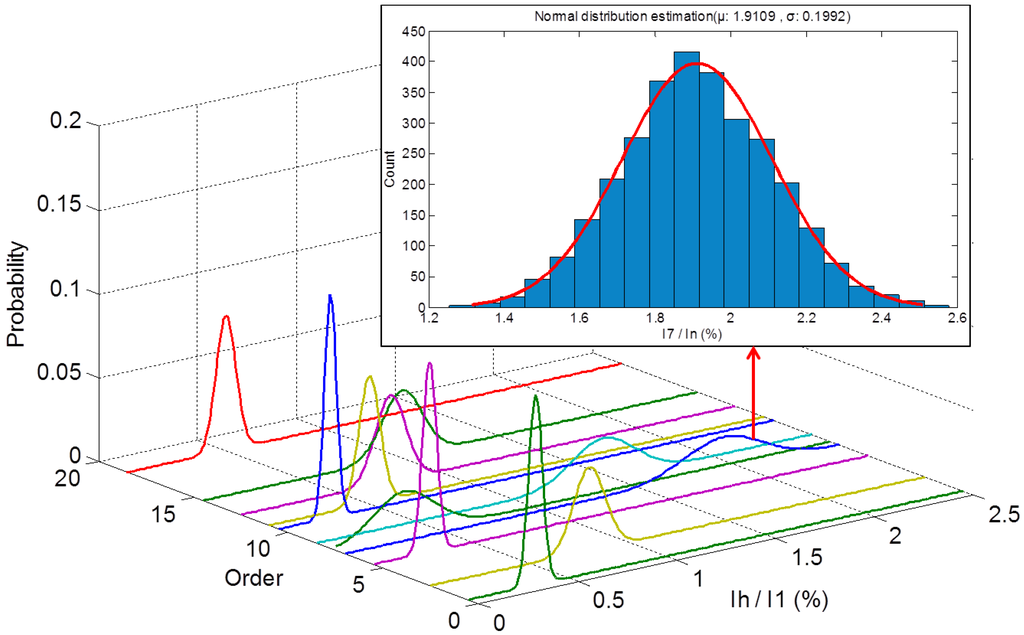 To capture the statistical characteristics of each harmonic component, we then fit probability density functions (PDFs) to the experimental data and incorporate them in the model as the noted frequency domain analysis in Figure 1. The maximum likelihood estimation (MLE) and chi-square goodness-of-fit test are finally applied to determine the best fit for each harmonic component among feasible PDFs.