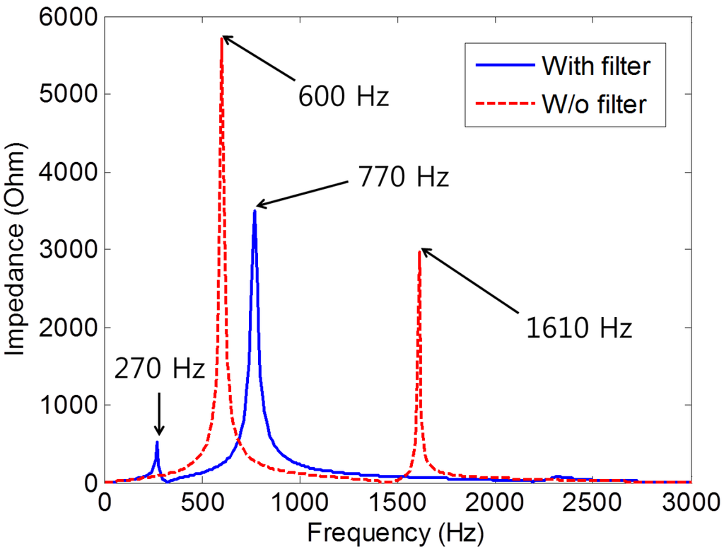 Frequency scan result at the point of connection (PoC). This system has two dominant resonance points: at 270 Hz and 770 Hz. W/o: without.