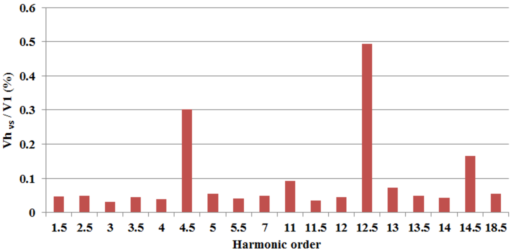 The measured data include the harmonics of interest, such as the harmonics in the range of the resonance frequency and the inter-harmonics near the switching frequency. Other negligible harmonic components are truncated to be zero. Although few unexpected negligible harmonics are revealed in the simulation (6.5th, 7.5th and 8th), the tendency of the harmonic generation of the turbine is closely reproduced. Due to the interaction between the filter impedance and harmonic components (discussed in Section 4), the seventh-order and 8.5th-order harmonics are two largest harmonic components generated by the turbine. The 14.5th harmonic component is also a significant harmonic component that is a sideband harmonic of the switching frequency. Figure 7 illustrates harmonic PDFs, which are approximated by the MLE on the detailed simulation results.