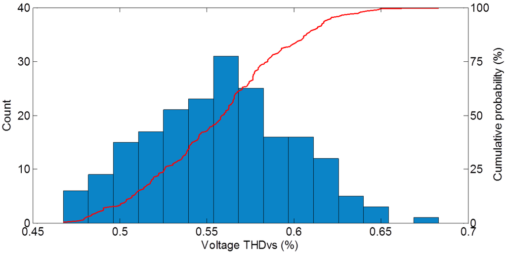 Two largest harmonic components at the 4.5th and 12.5th order result from the two resonance points of the WPP with PCS filter. Figure 11 illustrates the histogram and the cumulative probability of the very short time voltage total harmonic distortion (THD) values. The THD varies in the range from 0.4676% to 0.6829%, and the 99th percentile THD value is 0.6482%, which satisfies the requirement of the IEEE standard.