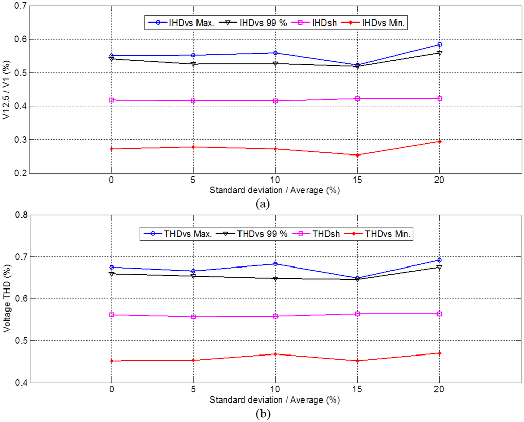 A change in the standard deviation and its effect on the harmonics at the PoC are investigated. The ratio of the standard deviation of each harmonic PDF to its average value is changed from 0% to 20% with its phase angle interval size of . Figure 12 shows the maximum value (circle), minimum value (star), 99% very short time harmonic value (triangle) and short time harmonic value (square) of the largest individual harmonic distortion (IHD, 12.5th order) and the voltage THD at the PoC.