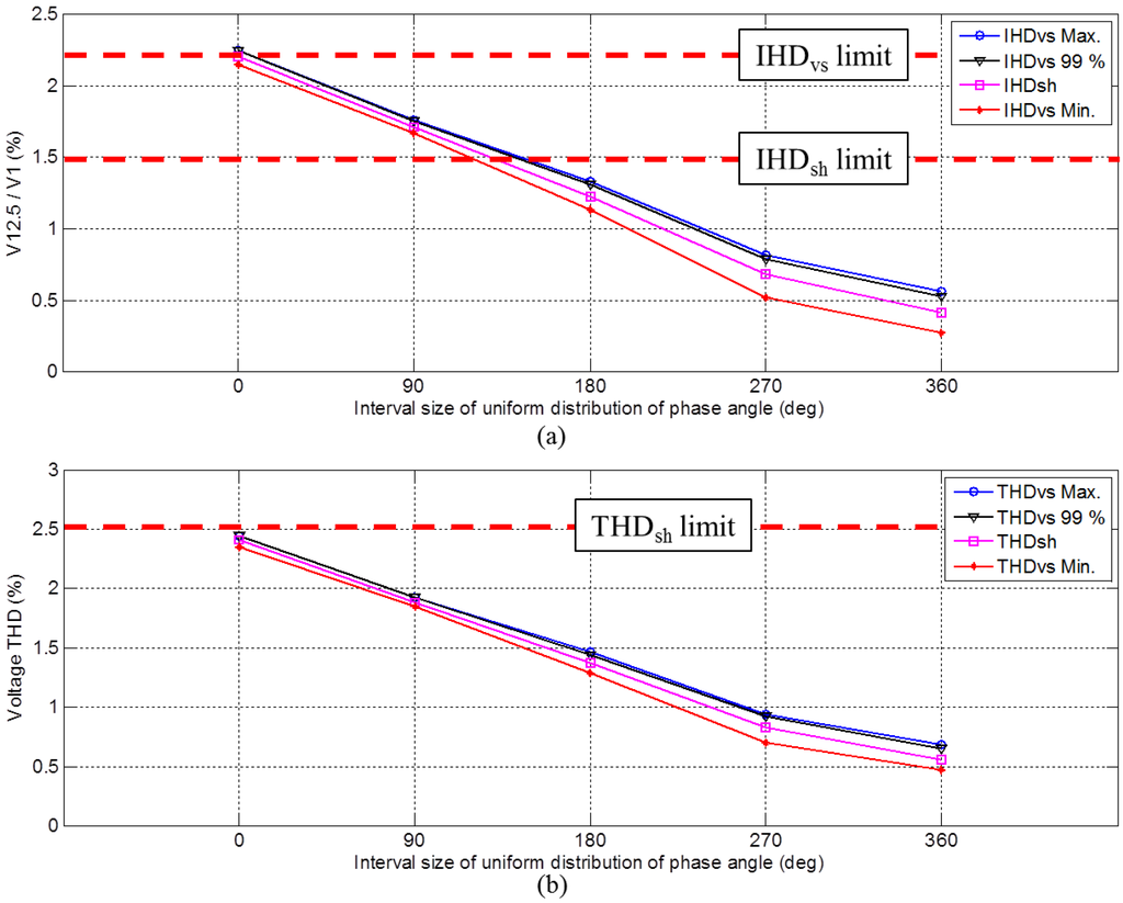 The phase angle of harmonics is still assumed to be uniformly distributed, and the interval size is now allowed to vary from zero to with 10% of the standard deviation over the average. For example, 90 degrees of the interval size means that the harmonic phase angle is generated in the range from zero to . Figure 13 shows the results of varying the interval size while other parameters are kept the same as in Figure 12.