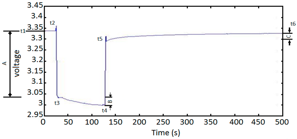 Phase B in Figure 3 consists of two parts. One part is the voltage drop of the terminal voltage which is caused by the pulse-current discharge. The second part is the voltage drop of the RC circuit. Thus we can easily get the voltage drop of the RC circuit. The zero-state response of the RC circuit is. By applying the least square method again, we can get the parameters and .