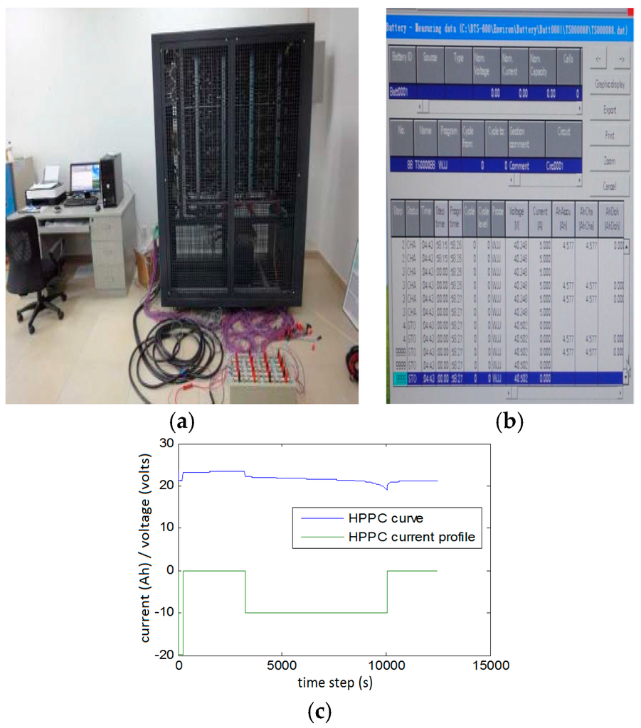 (a) Battery test bench (Digatron + batteries); (b) data acquisition system interface; and (c) hybrid pulse power characterization (HPPC) profile.