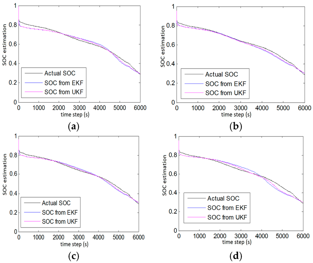 The higher the order of the polynomial function the better it fits as can be seen in Figure 5b,c and Figure 6a,c where a 4th order polynomial function produced better estimation results then a 3rd order polynomial function (Table 5). However, the logarithmic function showed good estimation results with PF, but overall, UKF not only better tracked the actual SoC but also produced good estimation results.