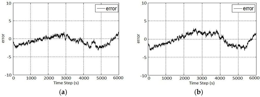 EKF and PF Error: (a) OCV Function 2; and (b) OCV Function 1.