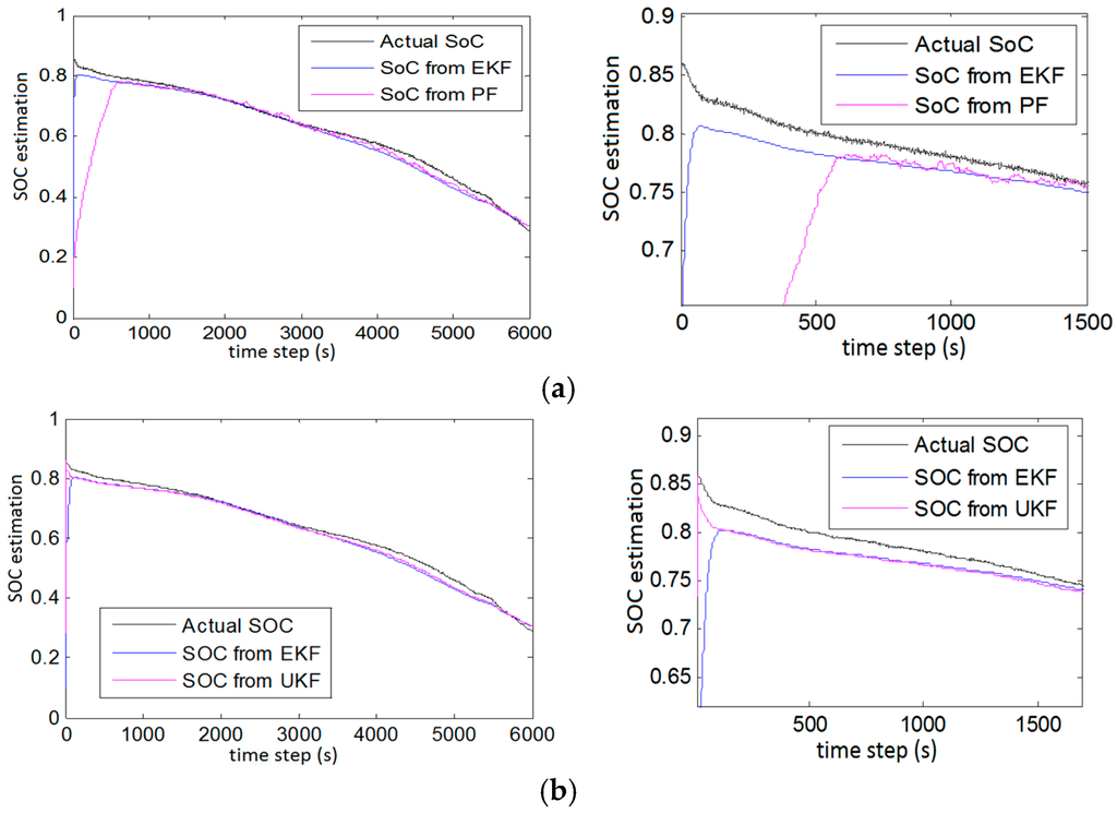 In Figure 8a, it can be seen that when incorrect SoC is given, i.e., initial SoC = 0.1, PF was affected the most. Although it started tracking the actual SoC later, it took some time to recover the initialization error. However, UKF proved better than EKF though they also suffered from initialization error recovery as shown in Figure 8b. Although both EKF and UKF were faster in terms of initialization error recovery but PF outperformed EKF when the battery model was affected by Gaussian noise or a higher order battery model is used which will add more non-linearity to the overall system shown in Figure 9.