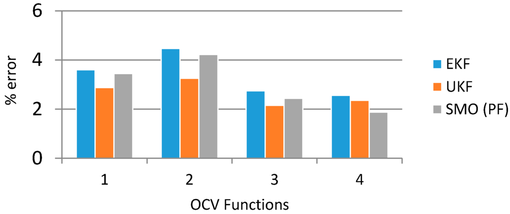 Choosing the right OCV function is the key to better estimating the SoC of the battery. Good estimation results were obtained when a logarithmic, exponential model with a polynomial exponent and high order polynomial functions were used. The overall performance of the logarithmic and high order polynomial functions is much better than that of exponential model with a polynomial OCV function (Figure 7).