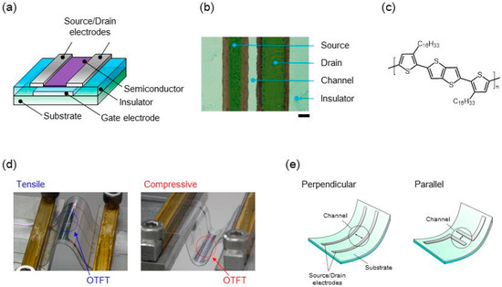 Figure 1a shows a schematic illustration of bottom-gate and bottom-contact OTFT devices that we fabricated. In order to improve mechanical durability of the printed OTFT device, we used poly[2,5-bis(3-hexadecylthiophen-2-yl)thieno[3,2-b]thiophene] (PBTTT-C16) as the organic semiconducting layer (Figure 1c) [,]. The procedure used for applying strain to the OTFT devices is explained in the experimental section of this paper.