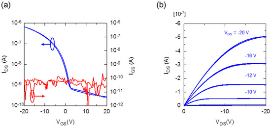 (a) Transfer characteristics of the fabricated OTFT device. The OTFT devices were monitored at VDS = −20 V, VGS = +20 to −20 V, and W/L = 1000/60 µm; (b) Corresponding output characteristics. The plot is IDS as a function of VDS for VGS from −10 V to −8 V in 2 V steps.