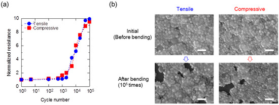 (a) Normalized resistivity of a printed electrode as a function of the number of bending cycles. The obtained data were normalized to resistivity value before bending; (b) Surface SEM images of the printed electrode before and after strain application. Scale bar, 100 nm.