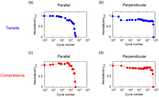 Stress cycling tests were also carried out on flexible printed OTFT devices. Figure 4 shows the changes of the IDS of the PBTTT-C16-based OTFT devices after 1.5% tensile and compressive strain repeatedly applied. The OTFT devices were monitored at VDS = −20 V, VGS = +20 to −20 V. The IDS was normalized to the initial value of IDS with the application of no strain at VGS = −10 V. The lines in the plots serve as visual guides. After applying a tensile strain, the IDS of the OTFT devices showed decreases that depended on the number of bending cycles in parallel or perpendicular directions to the current flow (Figure 4a,b). Specifically, in Figure 4, the strain shifted Vth of the OTFT devices, which occurred by applying the strain to the PBTTT-C16 OTFT devices. In this paper, we excluded the value of Vth shifts by calculating the electric characteristics of OTFT devices. Bending in the perpendicular direction demonstrated higher mechanical durability than in the parallel direction, which underwent 60,000 bending cycles. After the application of compressive strain to the OTFT devices, the behavior of the IDS decreases showed the same tendency as for tensile strain (Figure 4c,d). Incidentally, the IGS values of the OTFTs before applied strain are the following; tensile strain of parallel: 2 × 10−10 A, perpendicular: 3 × 10−10 A, compressive strain of parallel: 1 × 10−10 A, perpendicular: 8 × 10−10 A. The values of IGS did not surpass 1 × 10−10 A after applied strain. As a result, we found that the mechanical fatigue behavior of the OTFT devices depended on only the bending direction: parallel or perpendicular.