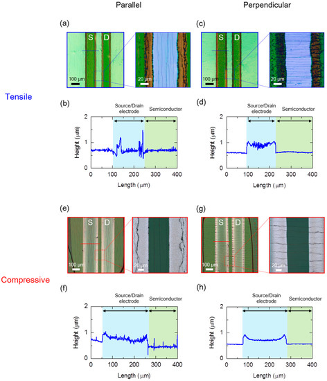 To understand the cause of the decreases in the IDS for the OTFT devices, their surface morphology was investigated using a laser microscope (Olympus OLS-4000, Tokyo, Japan) before and after stress cycles testing. Figure 5 shows the surface topography and cross-sectional profiles of the OTFT devices near the channel region after applying tensile and compressive stains for each bending direction. We showed the optical image of the OTFT devices before applied strain in Figure 1b. When applying tensile strain, cracks appeared along an edge of the source/drain electrode when the bending was applied to the device in the parallel direction (Figure 5a). In fact, these cracks interrupted the electrode and the semiconducting layer after applying the tensile stress (Figure 5b). On the other hand, when bending in the perpendicular direction, cracks appeared almost uniformly across the channel (Figure 5c). Unlike for the parallel bending, these cracks did not appear at the interface between the source/drain electrodes and the semiconducting layer (Figure 5d). The fact that topography was preserved at the interface could be the cause of saved IDS in the OTFT devices after applying strain. Likewise, changes in the topology of the OTFT devices after applying compressive strain in each bending direction exhibited the same tendency as the results when applying tensile strain (Figure 5e–h). These changes in topography corresponded to the reductions in the IDS for the OTFT devices. These results indicate that there is a correlation between reduced IDS and damage to the OTFT device structure. In particular, we learned that bending direction affected the amount of the IDS reduction by the mechanical fatigue of the OTFT devices. This study found that accumulation of mechanical stress at the interface between the source/drain electrodes and the semiconducting layer of the OTFT devices is the cause of damage in the flexible printed OTFT devices. In addition, selection of an optimal material for the source/drain electrodes improves the mechanical fatigue behavior in OTFT devices. In fact, Fukuda et al. recently discussed how the optimization of electrode materials can improve the mechanical durability when applying strain []. We will explore the use of better optimized OTFT device electrode materials in a follow-up study.