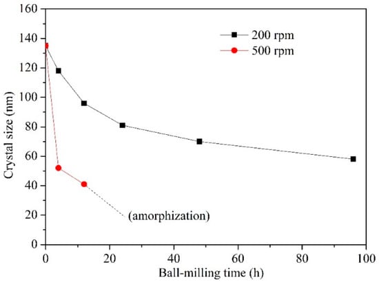 3 grain size with ball-milling time at the rotational speeds of 500 rpm and 200 rpm is shown in