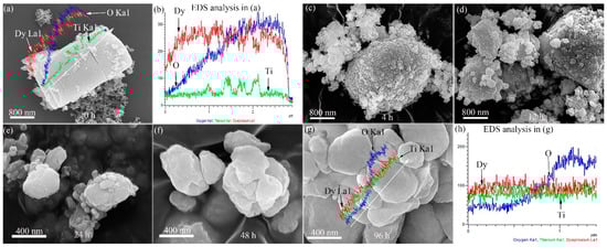 Figure 3a. It can be concluded that the particle size in the powder mixtures is refined to the nanoscale after ball milling for 96 h. The line-scanning results of elemental Dy, Ti, and O in the characteristic position in