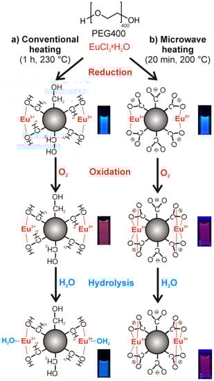 Taken together, fundamental understanding of the PL of Eu3+-modified C-dots and their stabilization is still lacking but essential for rational material optimization. In the following, we illustrate the role of Eu2+/Eu3+, the influence of O2 and H2O as well as the remarkable difference between conventional resistance heating and MW-heating on the surface functionalization and the resulting PL (Figure 1). With this knowhow, a one-pot, MW-mediated polyol synthesis of Eu3+-modified C-dots showing stable red emission in water is realized.