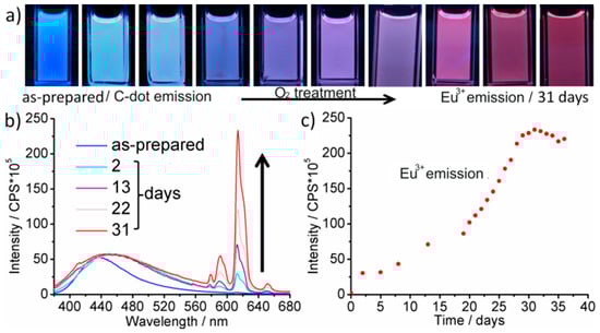 Dry air treatment of conventionally heated Eu-modified C-dots: (a) photographs with time-depending emission (UV-LED excitation); (b) PL spectra (normalized on C-dot emission at 440 nm); and (c) emission intensity of Eu3+ at 614 nm (all spectra with λexc = 366 nm).