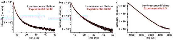 To elucidate the correlation of synthesis conditions and PL, Eu-modified C-dots were prepared under strict inert conditions (Ar) and, thereafter, stored under Ar (Figure 1a and Figure 2a). Even after two months the suspensions only show the typical broad blue emission of the C-dots upon UV-LED excitation (Figure 2a, SI: Figure S3a). Just a weak peak at 614 nm indicates f→f emission of Eu3+. Lifetime measurements (λexc = 375 nm, λem = 440 nm) could be fitted by a multi-exponential equation with decays of τ1 = 0.6, τ2 = 2.6 and τ3 = 11.3 ns (Table 1; Figure 3) that are in good agreement with previously reported lifetime data of C-dots [,,]. It is to be noted that an emission of Eu2+ is not to be expected since it would also occur in the blue to green spectral range. Moreover, the C-dot emission is significantly faster (τC-dot ~ 1–10 ns) and, therefore, much more efficient than Eu2+ emission (τEu2+ ~ 0.5–0.9 µs) [].