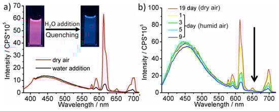 H2O-driven quenching of conventionally-heated Eu-modified C-dots: (a) photographs and PL spectra with time-depending emission upon addition of water (UV-LED excitation); and (b) PL spectra during humid air treatment (λexc = 366 nm; normalized on C-dot emission at 440 nm).