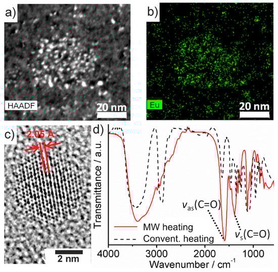 Transmission electron microscopy (TEM), high-angle annular dark-field scanning transmission electron microscopy (HAADF-STEM), and energy dispersive X-ray spectroscopy (EDXS) were conducted with a FEI Osiris microscope (FEI, Hillsboro, OR, USA) at 200 kV, equipped with a Bruker Quantax system (XFlash detector). TEM samples of MW-heated Eu3+-modified C-dots were prepared by vacuum evaporation of aqueous suspensions at 120 °C on amorphous carbon (lacey-) film-coated copper grids.
