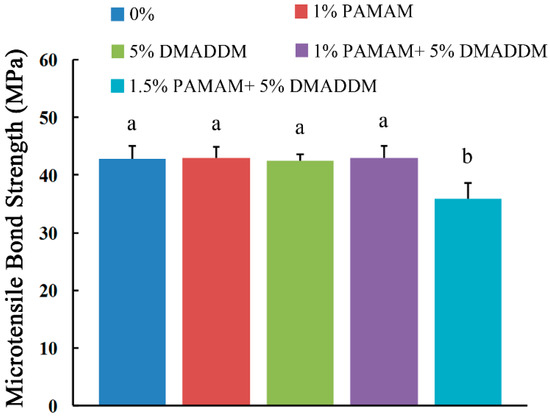Microtensile bond strength of adhesive (mean ± sd; n = 6). Bars with the same letter indicate values that have no significant difference (p > 0.1) and those with the dissimilar letters indicate a significant difference (p < 0.05).