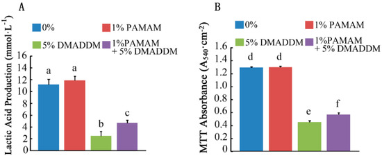 The lactic acid production of biofilms is plotted in Figure 3A (mean ± sd; n = 6). Compared with the 0% group, the 1% PAMAM group showed no significant difference (p > 0.1). When DMADDM and PAMAM were incorporated, the 1% PAMAM + 5% DMADDM group showed a significant decrease in lactic acid production (p < 0.05), though it was slightly higher than the 5% DMADDM group alone (p < 0.05).