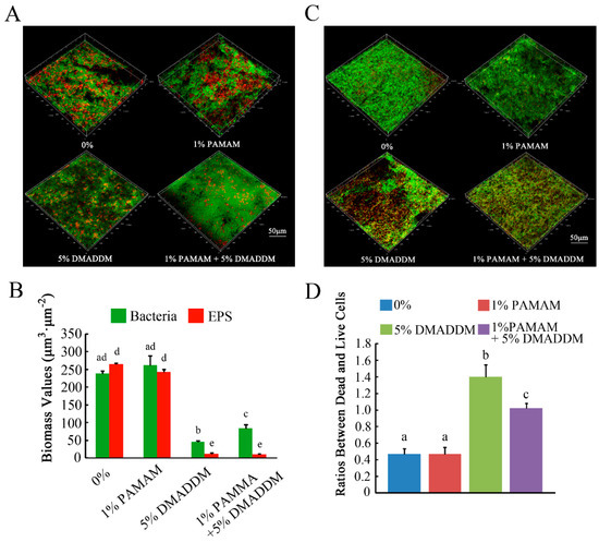 Figure 4A shows the distribution of bacteria and EPS in the biofilms of the four groups. Bacteria were stained green, while EPS were stained red. In the 0% group, more bacteria and EPS were observed, similar to the 1% PAMAM group. In the 1% PAMAM + 5% DMADDM group, the bacteria and EPS were reduced significantly, but not less than those in the 5% DMADDM group. Figure 4B shows the results of relative fluorescence of bacteria and EPS production. Compared to the 0% and 1% PAMAM groups, bacteria and EPS production decreased in the 1% PAMAM + 5% DMADDM group. Representative Confocal Laser Scanning Microscope (CLSM) images of live/dead staining of biofilms are shown in Figure 4C. Live bacteria were stained green, while dead bacterial were stained red. Yellow color appeared because of the limitation of staining kits [17]. The ratios between dead and live bacteria computed with three randomly selected views of each group were plotted in Figure 4D.