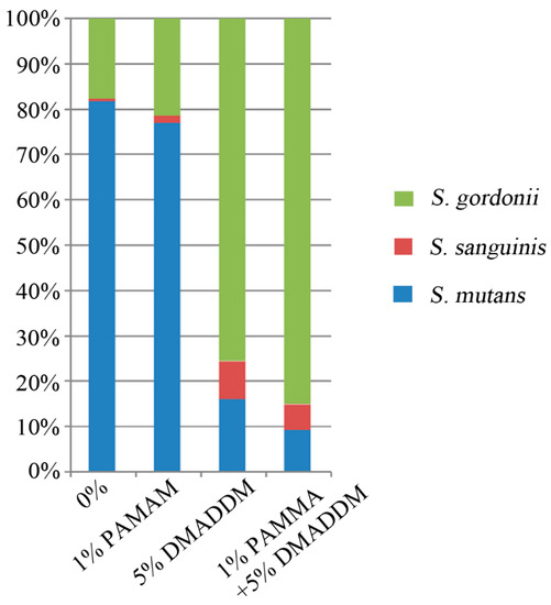 The RT-PCR results are plotted in Figure 5. In the 0% group, there was an increasing proportion of Streptococcus mutans in biofilms, with the percentage reaching 81.74%. The proportions of Streptococcus sanguinis and Streptococcus gordonii were only 0.52% and 17.74%, respectively. In the 1% PAMAM group, the proportion of S. mutans was also increasing to 77.09%, not higher than that in the 0% group, while the proportions of S. sanguinis and S. gordonii increasing to 1.48% and 21.43%. In the 5% DMADDM group, there was a significant decrease of the proportion of S. mutans to 16.11%, while the proportions of S. sanguinis and S. gordonii increased to 8.43% and 75.47%. Interestingly, in the 1% PAMAM + 5% DMADDM group, the proportion of S. mutans decreased to 9.34%, while the proportions of S. sanguinis and S. gordonii significantly increased to 5.57% and 85.10%, respectively.