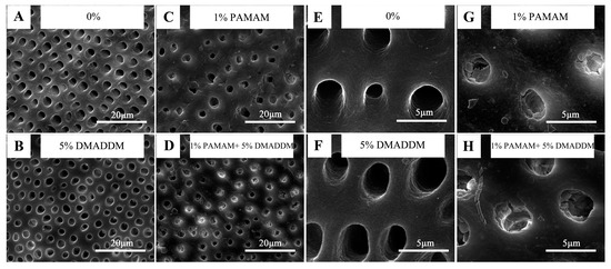 The remineralization effect of the dentin disks is shown in Figure 6. After 14 days of immersion in artificial saliva solution, there was nothing in dentin tubules in the 0% group, similar to the 5% DMADDM group. However, in both the 1% PAMAM and 1% PAMAM + 5% DMADDM group, the dentin tubules were filled with newly formed minerals, justifying that DMADDM has no side effect on the remineralization ability of PAMAM.