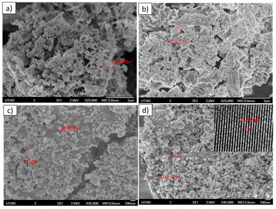 The surface of morphology of g-C3N4 before and after the hydrothermal treatment is shown in Figure 1. The spongy “morel-like” structure in Figure 1a reveals that the synthesized g-C3N4 possesses a high specific surface area. The alkaline hydrothermal treatment transformed the porous nanostructured of g-C3N4 to clustered nanotubes geometry with lower specific surface area (Figure 1b). This phenomenon is attributed to the complication of self-assembly process during the fabrication of 1D g-C3N4 nanotubes [11]. The alloyed TiO2 nanoparticles are well-distributed on the surface of porous structred g-C3N4 (Figure 1c). As illustrated in Figure 1d, the reducing specific surface area of HT-g-C3N4 hindered the uniform dispersion of TiO2 nanoparticles on their surface, resulting in the agglomeration of TiO2 onto HT-g-C3N4/TiO2. The inset in Figure 1d depicts the lattice fringes that signify the presence of TiO2 (0.35 nm) in the prepared binary composite.
