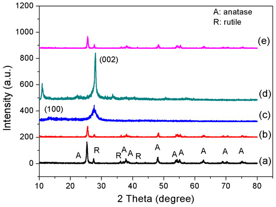 X-ray diffraction pattern of photocatalysts (a: P25; b: HT-g-C3N4/TiO2; c: g-C3N4; d: HT-g-C3N4; e: g-C3N4/TiO2).