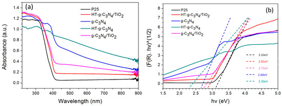 (a) Ultraviolet-visible (UV-vis) absorption spectra; (b) Tauc plots of P25, HT-g-C3N4/TiO2, g-C3N4, HT-g-C3N4, and g-C3N4/TiO2.