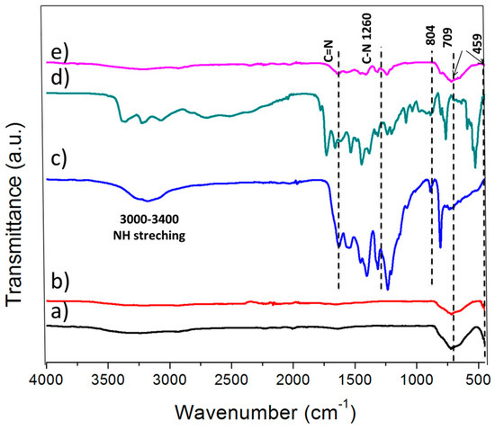Absorption and emission Fourier transform infrared spectra of (a: P25; b: HT-g-C3N4/TiO2; c: g-C3N4; d: HT-g-C3N4; e: g-C3N4/TiO2).