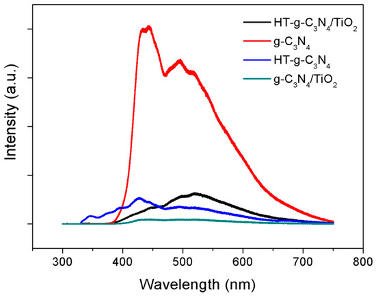 The PL spectra in Figure 5 were obtained to understand the separation of charge carrier progressed in photocatalysis for all samples. The emission peak of g-C3N4 is the highest compared to the rest, implying the rapid recombination of photogenerated electrons and holes. The defects in crystal structure of g-C3N4 become the recombination centers for photoinduced electrons and holes during the photocatalysis [24]. However, the emission peak was obviously quenched after alloying TiO2 with g-C3N4, the lifespan of the electrons and holes was extended when the electrons mobilize from g-C3N4 to the conduction band of TiO2 [25]. The PL intensity of HT-g-C3N4 is also lower than that of g-C3N4, signifying a sharp decline in the number of defects achieved through alkaline hydrothermal treatment. Further, it also indicates that the 1D nanotube structure of HT-g-C3N4 offers sufficient lengths to capture incident photons and provides facile separation of charges and results in higher photoefficiency.
