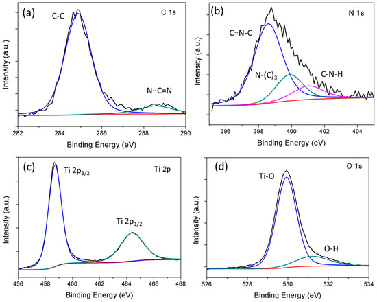 The chemical states of C, N, Ti, and O in binary composites are investigated by XPS and the obtained results are displayed in Figure 6. The C 1s spectrums are deconvoluted into two distinct peaks with binding energies at 284.8 eV and 288.3 eV, attributable to the C–C coordination of sp2 graphitic carbon [26,27] and sp2-bonded carbon (N–C=N) of the s-triazine rings, respectively [28]. For the N 1s spectrum, the peak at 398.6 eV is assigned to sp2 hybridized aromatic N bonded to carbon atoms (C=N–C). The peak at 399.7 eV confirms the presence of s tertiary nitrogen N–(C)3 group linking structural motif (C6N7) or amino groups carrying hydrogen ((C)2–N–H) in connection with structural defects and incomplete condensation [29]. Another peak at 401.1 eV is attributable to the quaternary N bonded three carbon atoms (C–N–H) in the aromatic cycles [14,30,31]. The two distinct peaks observed at 459 eV (Ti 2p3/2) and 464.5 eV (Ti 2p1/2), both correspond to Ti4+ in pure anatase [32]. The O 1s spectrum displays two peaks at 530 eV and 531.3 eV which correspond to Ti–O bond and O–H bond, respectively [33].