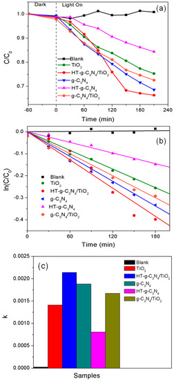 The photocatalytic performance followed an order of HT-g-C3N4/TiO2 > g-C3N4 > g-C3N4/TiO2 > TiO2 > HT-g-C3N4 > blank. There was almost no change with time in the absence of catalyst, proving that BPA is a poor photosensitizing compound. All samples showed a relatively slight adsorption capacity (~1%) towards the BPA during the dark adsorption process. The P25 TiO2 showed a relatively good photocatalytic degradation of BPA due to the positive interaction between anatase and rutile phase which facilitated the charge separation. Although HT-g-C3N4 possesses 1D nanotube structure and superior visible light harvesting properties, it did not lead to a greater photoefficiency. Its photocatalytic performance was restricted by its smaller specific surface area (6.29 m2·g−1) compared to that of pure g-C3N4 (71.78 m2·g−1) after the change in morphology. However, it was clear that the loading of TiO2 onto the surface of HT-g-C3N4 significantly increased the surface area and improved the degradation efficiency of BPA at 2.16 times higher than the pure HT-g-C3N4. The rapid transportation of photoinduced charge carriers at the interface between HT-g-C3N4 and TiO2 is due to the heterostructure of the binary composite which also played a vital role in the enhancement of photocatalytic performance [34,35]. Although g-C3N4 g suffered from the fast carrier recombination rate [16], it still exhibited better degradation efficiency of BPA (k = 0.00188 min−1) when compared to that of HT-g-C3N4 (k = 0.00081 min−1). This is attributed to its excellent visible light harvesting properties and relatively large surface area, and thus more active adsorption sites were available for the reactants. In the binary composite of g-C3N4/TiO2, the loading of TiO2 nanoparticles significantly suppressed the carrier recombination rate but decreased the surface area of the binary composite, leading to a degradation efficiency of g-C3N4/TiO2 1.24 times lower than HT-g-C3N4/TiO2.