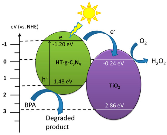 where X is the electronegativity of the semiconductor; EVB and ECB are the valence band and conduction band edge potential, respectively; EC is the energy of free electrons on the hydrogen scale (~4.5 eV vs. NHE); and Eg is the band gap energy of the semiconductor. The X values of the HT-g-C3N4 and TiO2 are 4.64 eV and 5.81 eV, respectively [36,37]. The band gap energy of HT-g-C3N4 and TiO2 are 2.68 eV and 3.1 eV, respectively. The VB and CB were theoretically calculated at (1.48 eV, −1.20 eV) and (2.86 eV, −0.24 eV) for HT-g-C3N4 and TiO2, respectively. The narrow band gap energy (2.68 eV) of HT-g-C3N4 enables easy excitation of electrons upon the irradiation of visible light. The photoinduced electrons transferred from the valence band (VB) to the conduction band (CB) of HT-g-C3N4. Although there was no excitation in TiO2, it can accumulate the electrons injected from the CB of HT-g-C3N4 since the CB edge potential of HT-g-C3N4 (−1.20 eV) is more negative than that of TiO2 (−0.24 eV). It is noteworthy that the dominant negative redox potential of O2/•O2− (−0.33 eV) inhibits the reduction reaction between the trapped electrons in the CB of TiO2 and O2. However, these electrons can reduce O2 to H2O2 and further to hydroxyl radical (•OH) due to the favorable redox potential of O2/H2O2 (0.695 eV) [19,38]. The generated strong oxidizing radicals (standard redox potential +2.8 eV) were actively involved in the degradation of BPA. Meanwhile, the photoinduced holes in HT-g-C3N4 with higher oxidation potential (1.48 eV vs. NHE) can directly oxidize BPA because the VB level of HT-g-C3N4 (1.48 eV) is too low to oxidize H2O (2.27 eV) [39]. In the binary composite, the loading of TiO2 onto the surface of HT-g-C3N4 could act as an electron acceptor to facilitate the separation of electron-hole pairs and store the separated electrons. Hence, the lifetime of charge carries was prolonged, leading to improved photocatalytic performance. In the photocatalytic degradation of BPA, assorted intermediates like benzoquinone, hydroxyacetophenon, phenol, 2-(4-hydroxyphenyl)-2-propanol, and isopropylphenol have been determined by several researchers [40,41]. Besides, short-chain aliphatic acids such as citric, maleic, acetic, tartaric, and formic acids ensuing from aromatic cleavage were also reported [40].