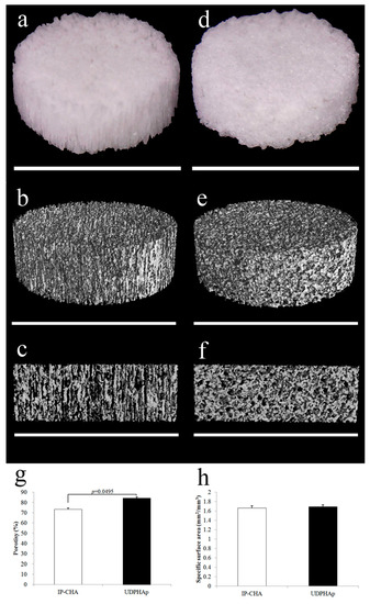 Representative photographs and Micro-CT analysis of porous hydroxyapatite scaffolds. Gross appearance and 3D image renderings from micro-CT scans of (a–c) UDPHAp and (b–d) IP-CHA. White bars are 5 mm; (g) Porosity and (h) SSA of UDPHAp and IP-CHA. Values are mean ± SD; n = 3 analyzed by Mann-Whitney U test.