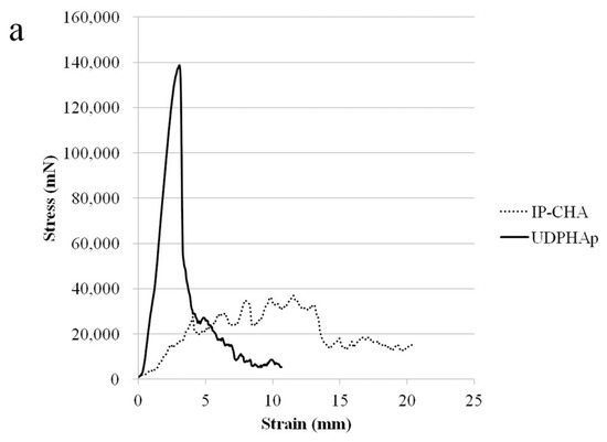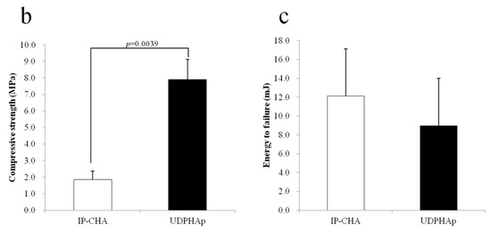 Figure 2a shows the stress-strain curves of the IP-CHA and UDPHAp, respectively. The UDPHAp endured more stress than the IP-CHA at the point of yield but fractures catastrophically, while the IP-CHA showed no clear yield point and exhibits a non-brittle failure by a lower stress than the UDPHAp. This shows that the UDPHAp exhibits a different fracture behavior than that of the IP-CHA. The maximum compressive strengths of the UDPHAp and IP-CHA were 7.89 ± 1.23 MPa and 1.92 ± 0.53 MPa, respectively. The UDPHAp showed a significantly higher maximum compressive strength than the IP-CHA (p = 0.0039). However, yield compression after the initial breakdown was longer in the IP-CHA than in the UDPHAp, and breaking energy showed no significant difference between the two groups (8.99 ± 2.72 vs. 13.95 ± 5.69 mJ, p = 0.055) (Figure 2b,c).