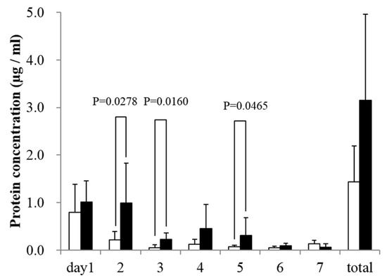 The rhBMP-2 release was observed in both UDPHAp and IP-CHA groups. On days 2, 3, and 5, UDPHAps released more rhBMP-2 compared to IP-CHAs (p = 0.0278, 0.0160, 0.0465, respectively). Total amount of released rhBMP-2 was 3.15 ± 1.81 µg in the UDPHAp group compared to 1.44 ± 0.75 µg in the IP-CHA group as shown in Figure 3.