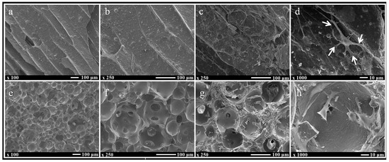 SEM images with and without cells. (a,b) UDPHAp and (e,f) IP-CHA without cells; (c,d) UDPHAp and (g,h) IP-CHA with MC3T3-E1 cells attached onto each surface of the scaffold. White arrows indicate filopodia. White bars represent 100 µm (a–c and e–g) and 10 µm (d,h).