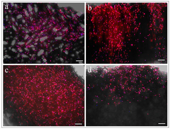 MC3T3-E1 cells that are broadly used for researching cell proliferation and differentiation on the bone tissue engineering scaffold [19] were seeded at 1 × 104 cells/scaffold (n = 3), transferred to another 96-well plate, and cultured in 200 µL of alpha-MEM for four days by the same method described in the previous section. Cells were fixed for an hour with 4% paraformaldehyde, treated an hour with 0.1% Triton-X, and stained with FITC-phalloidin (Sigma Aldrich, St. Louis, MO, USA) to show F-actin (red) + bisbenzimide H33342 fluorochrome trihydrochloride (Nacalai Tesque, Kyoto, Japan) and nuclei (blue) for an hour. After washing in PBS (Nacalai Tesque, Kyoto, Japan), they were observed with a fluorescence microscope (BZ-X700; Keyence, Tokyo, Japan). Each scaffold was cut parallel to the axial direction of the cylinder in the middle, and we observed the cell adhesion style at the top and inside of the scaffold.