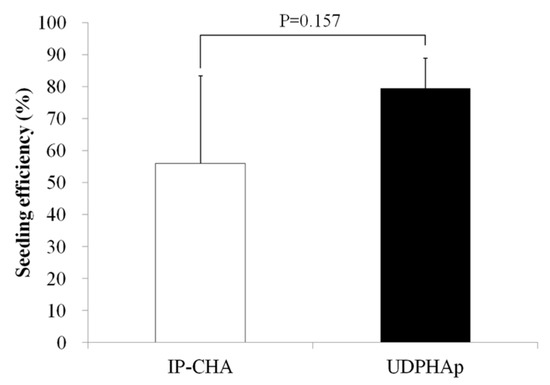 Figure 6 shows the seeding efficiency for each scaffold type. The seeding efficiencies of IP-CHA and UDPHAp were approximately 56% and 79%, respectively. No significant differences were noted in the results between the two scaffolds (p = 0.157).