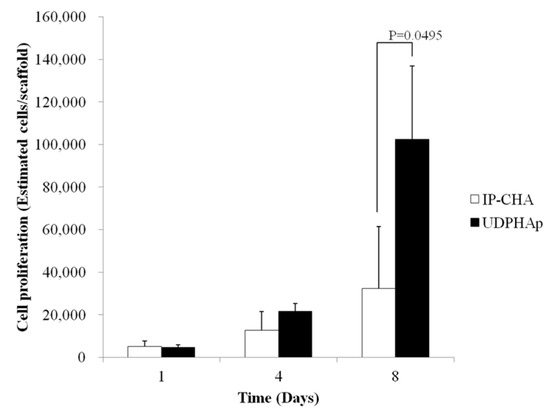 On day 1 and day 4, no significant difference in cell proliferation between the UDPHAp and IP-CHA was observed (4627 ± 1213 vs. 5013 ± 2716 cells per scaffold, p = 0.5127 and 21,598 ± 3607 vs. 12,570 ± 8792 cells per scaffold, p = 0.2752, respectively). On day 8, a significant increase in cell number on the UDPHAp was observed compared to the IP-CHA (102,479 ± 34,391 vs. 32,372 ± 29,061 estimated cells per scaffold, p = 0.0495) (Figure 7).