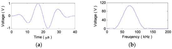 Excitation signal (fc = 75 kHz). (a) Waveform; (b) Spectrum.